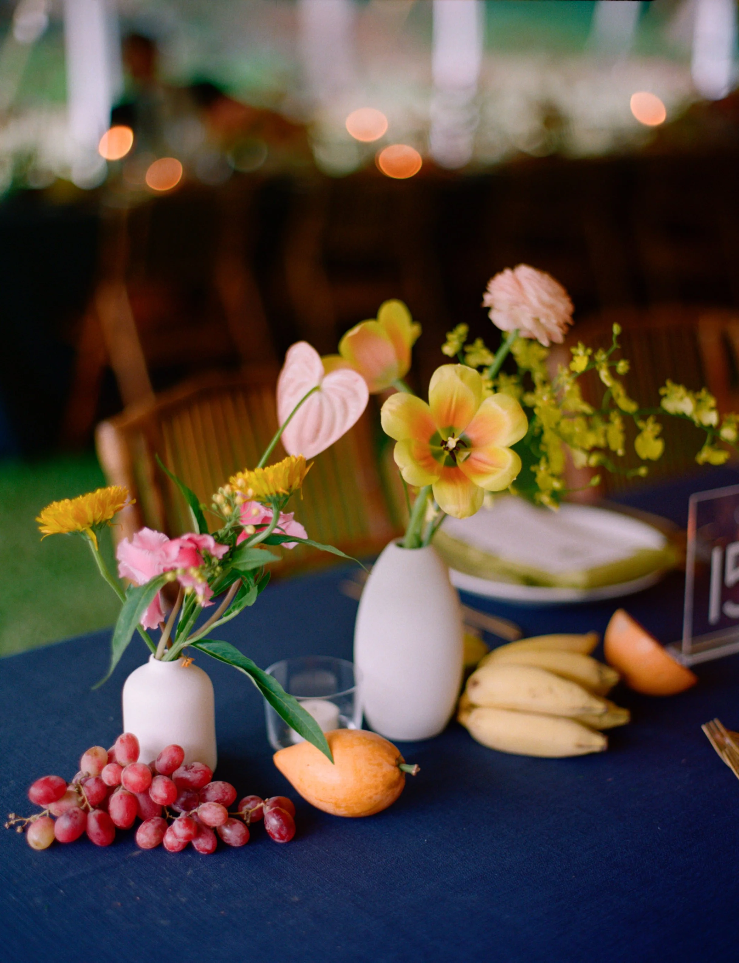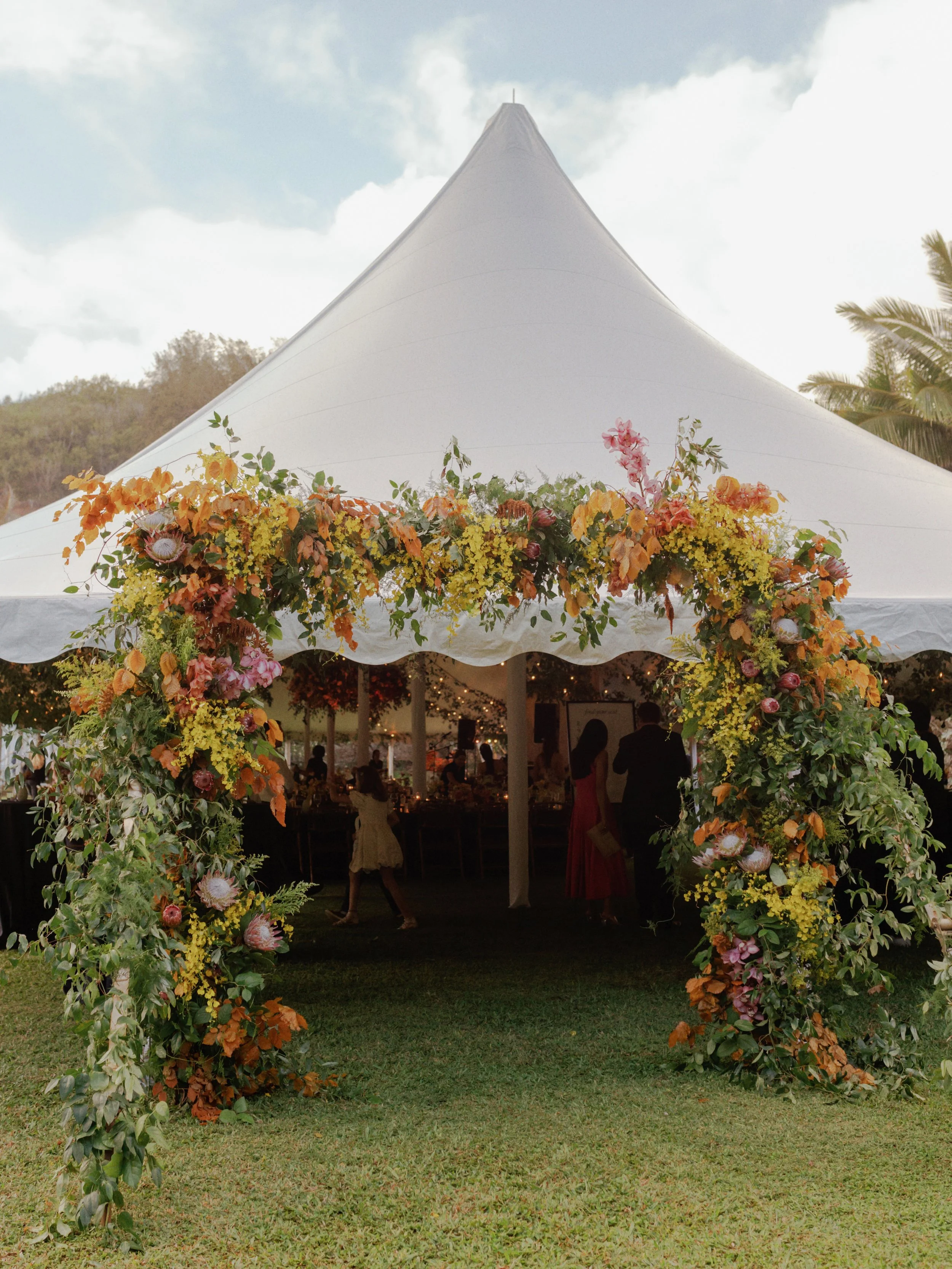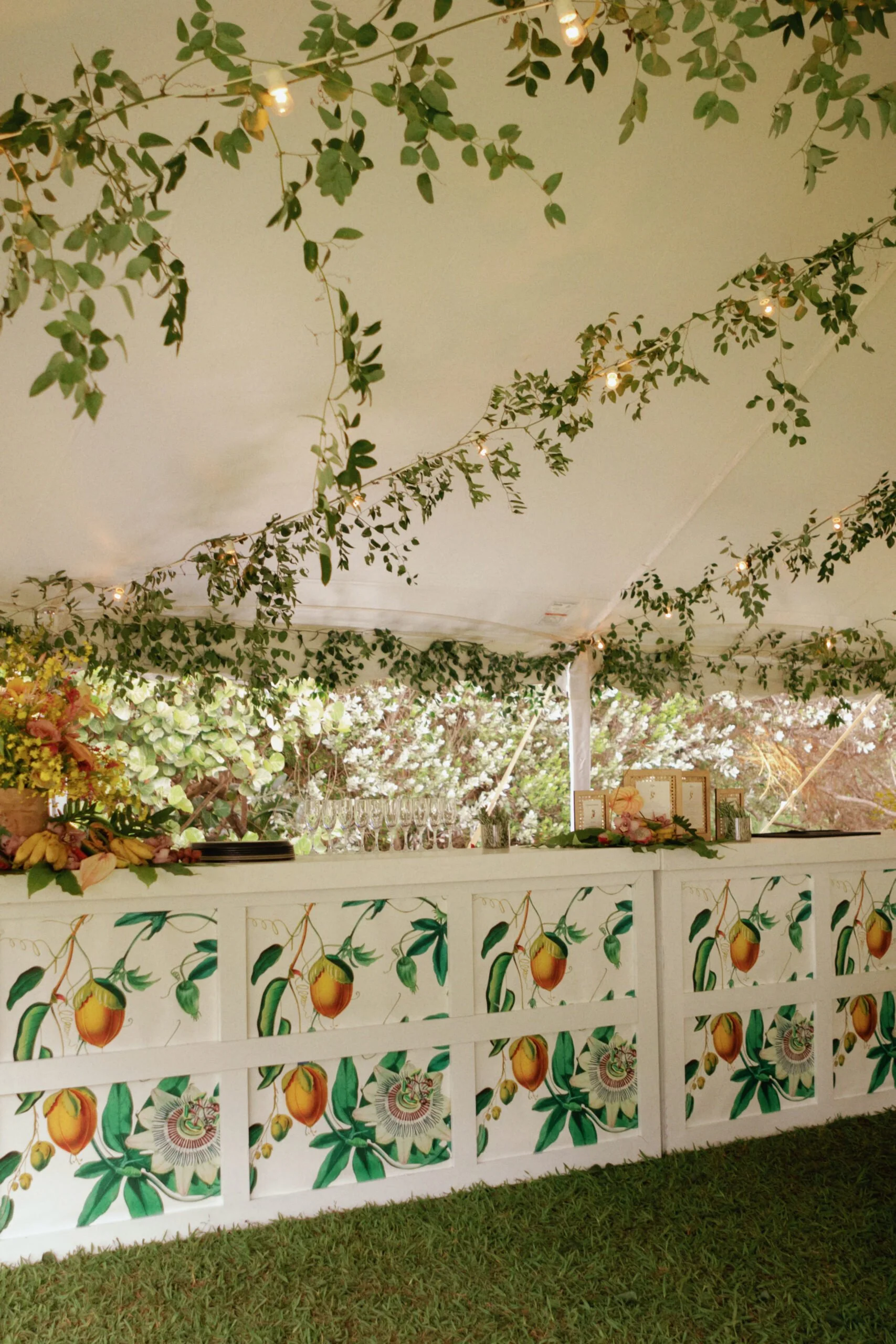The finer details were considered, including a custom tropical pattern that moved across paper goods and design elements, creating a sense of continuity from one space to the next. A passing rain just before the ceremony gave way to sun, setting the tone for an evening beneath a tent filled with guests, color, and conversation. The entire weekend felt vibrant and personal, grounded in both place and tradition.