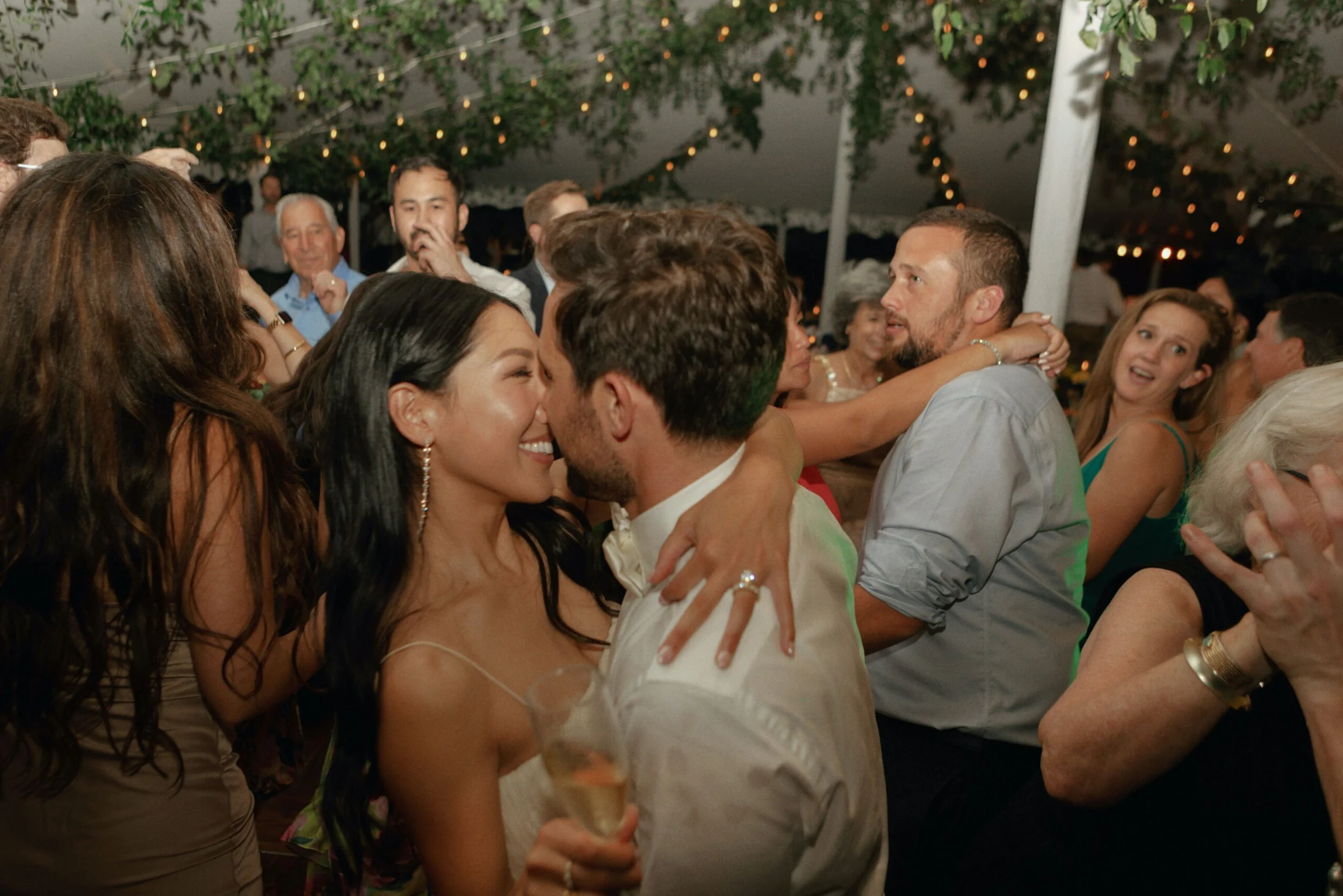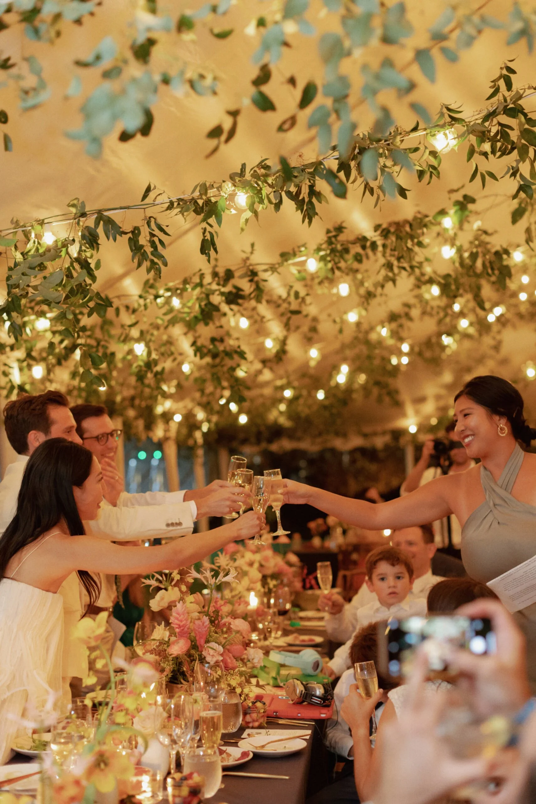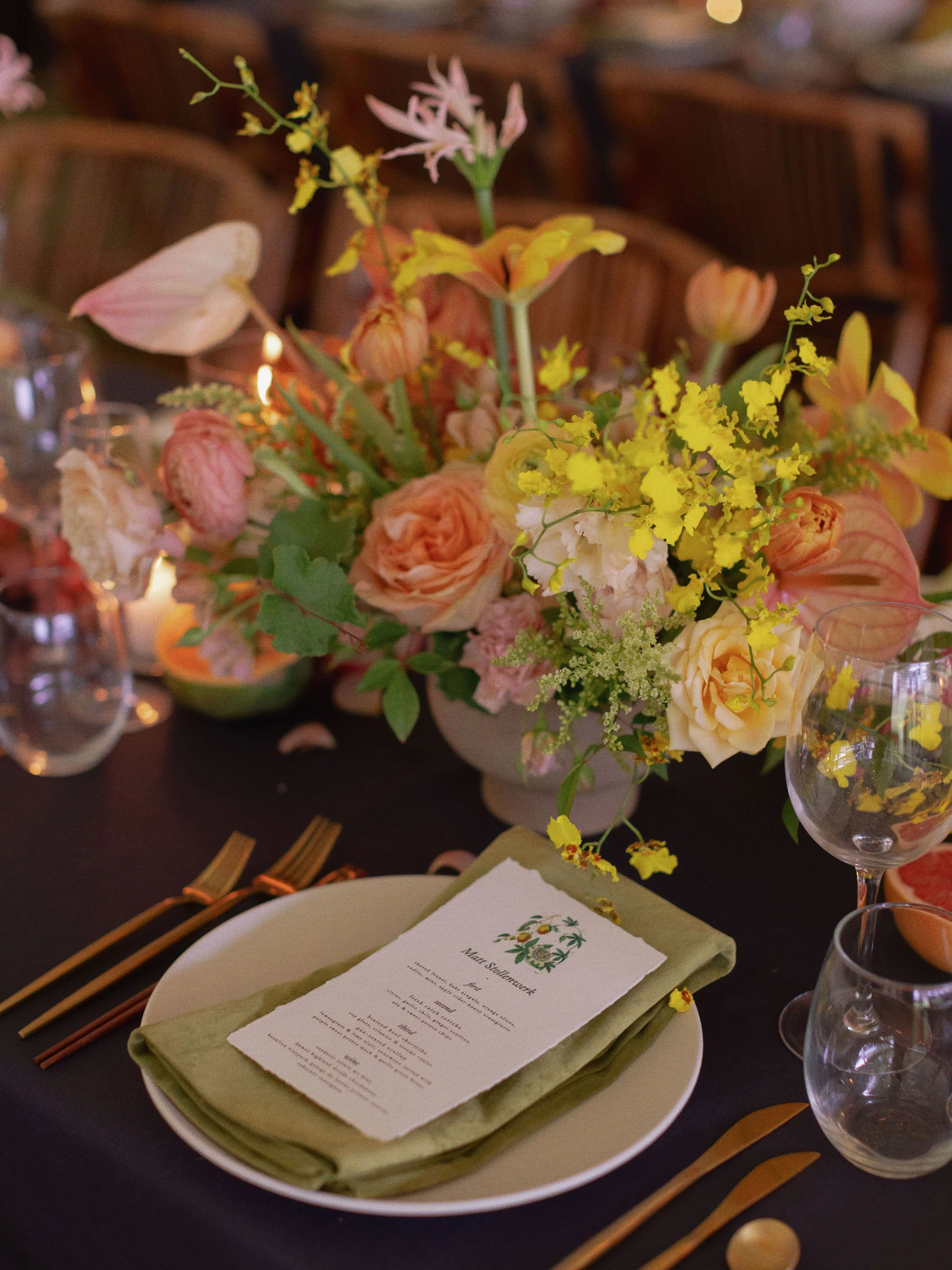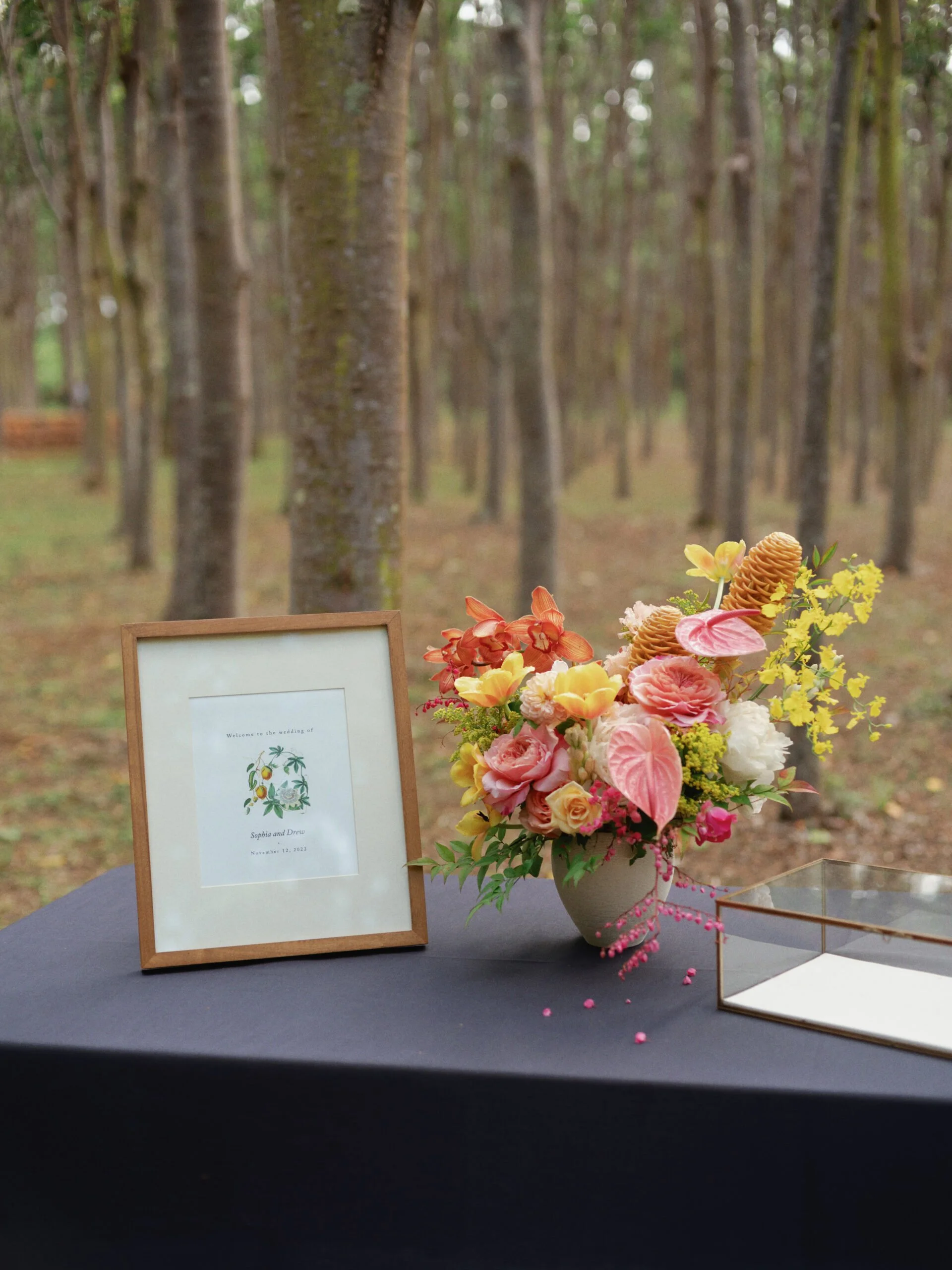 The finer details were considered, including a custom tropical pattern that moved across paper goods and design elements, creating a sense of continuity from one space to the next. A passing rain just before the ceremony gave way to sun, setting the tone for an evening beneath a tent filled with guests, color, and conversation. The entire weekend felt vibrant and personal, grounded in both place and tradition.