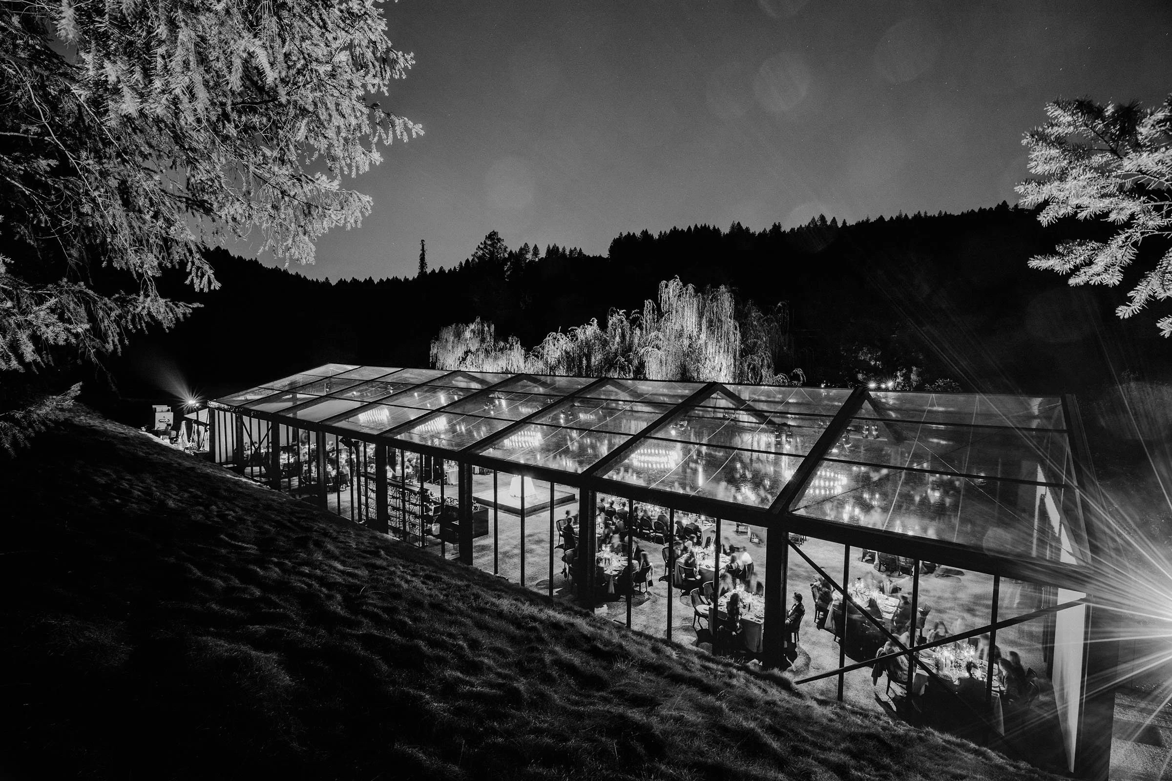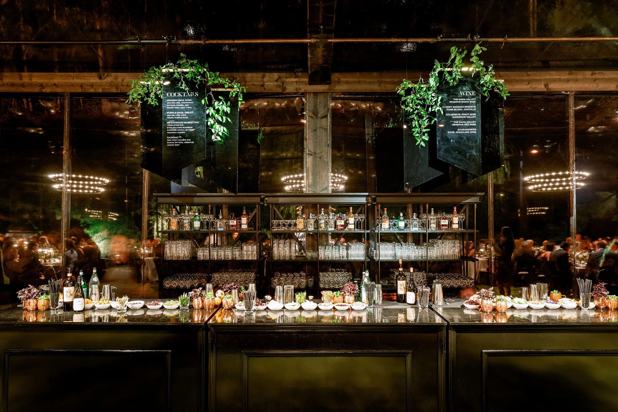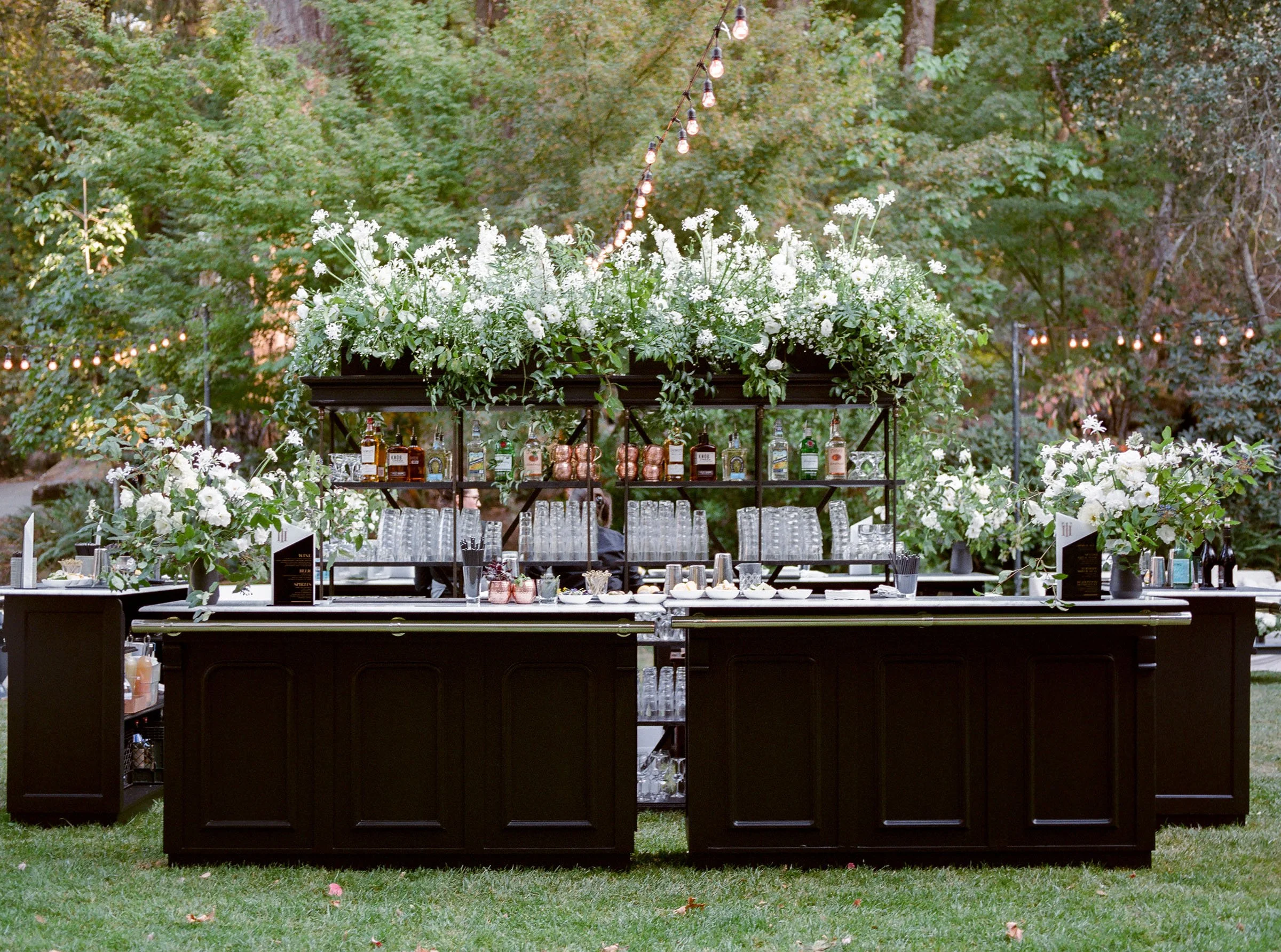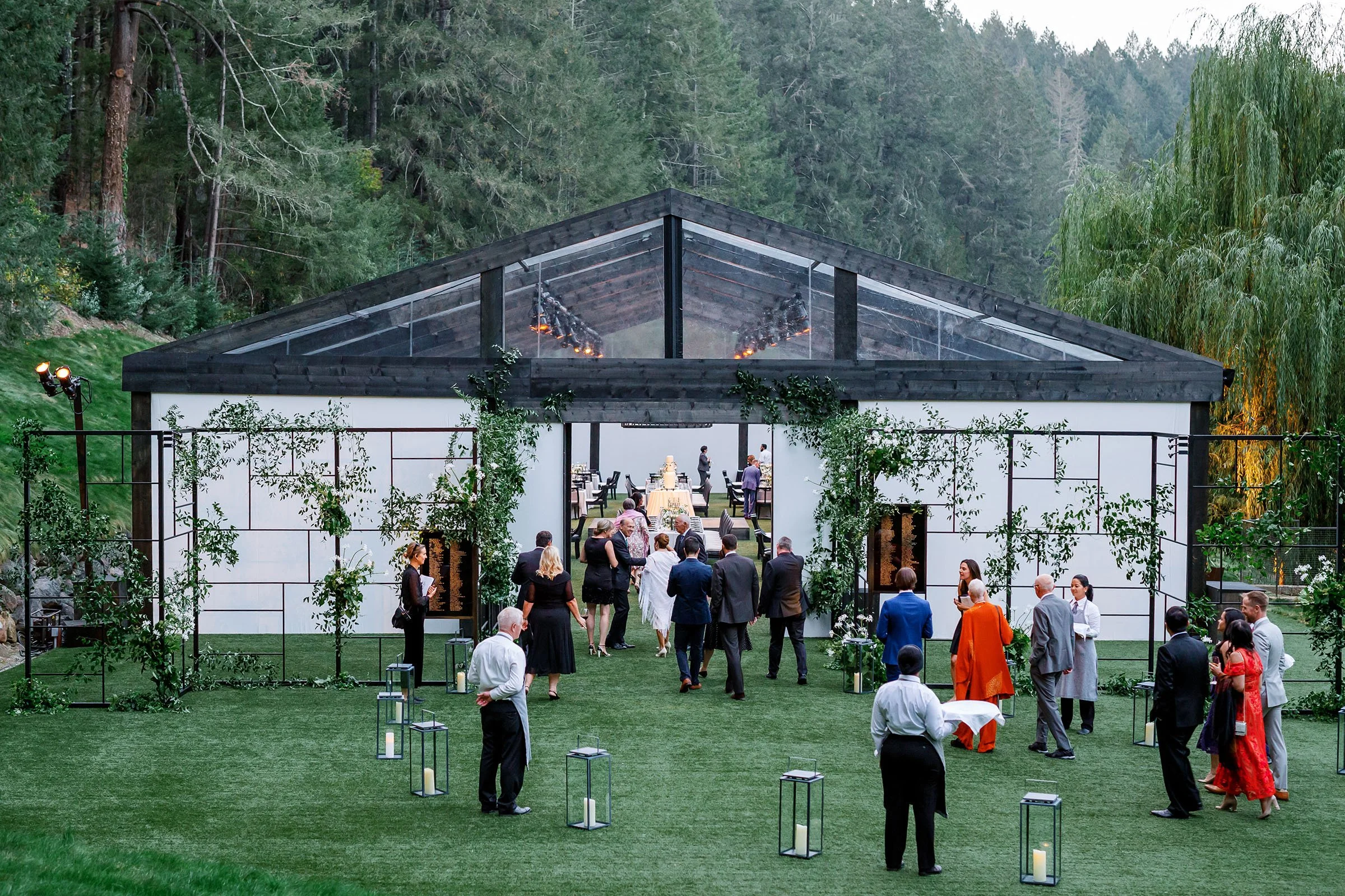 Custom-built elements shaped the environment, from a fully constructed tent with black-stained wood and cane detailing to an interactive entrance guests moved through as they arrived. When power was shut off across Napa Valley due to fire risk conditions, a coordinated plan allowed the celebration to run on generators. The evening unfolded seamlessly—guests dined, danced, and moved through the night, largely unaware anything had changed.